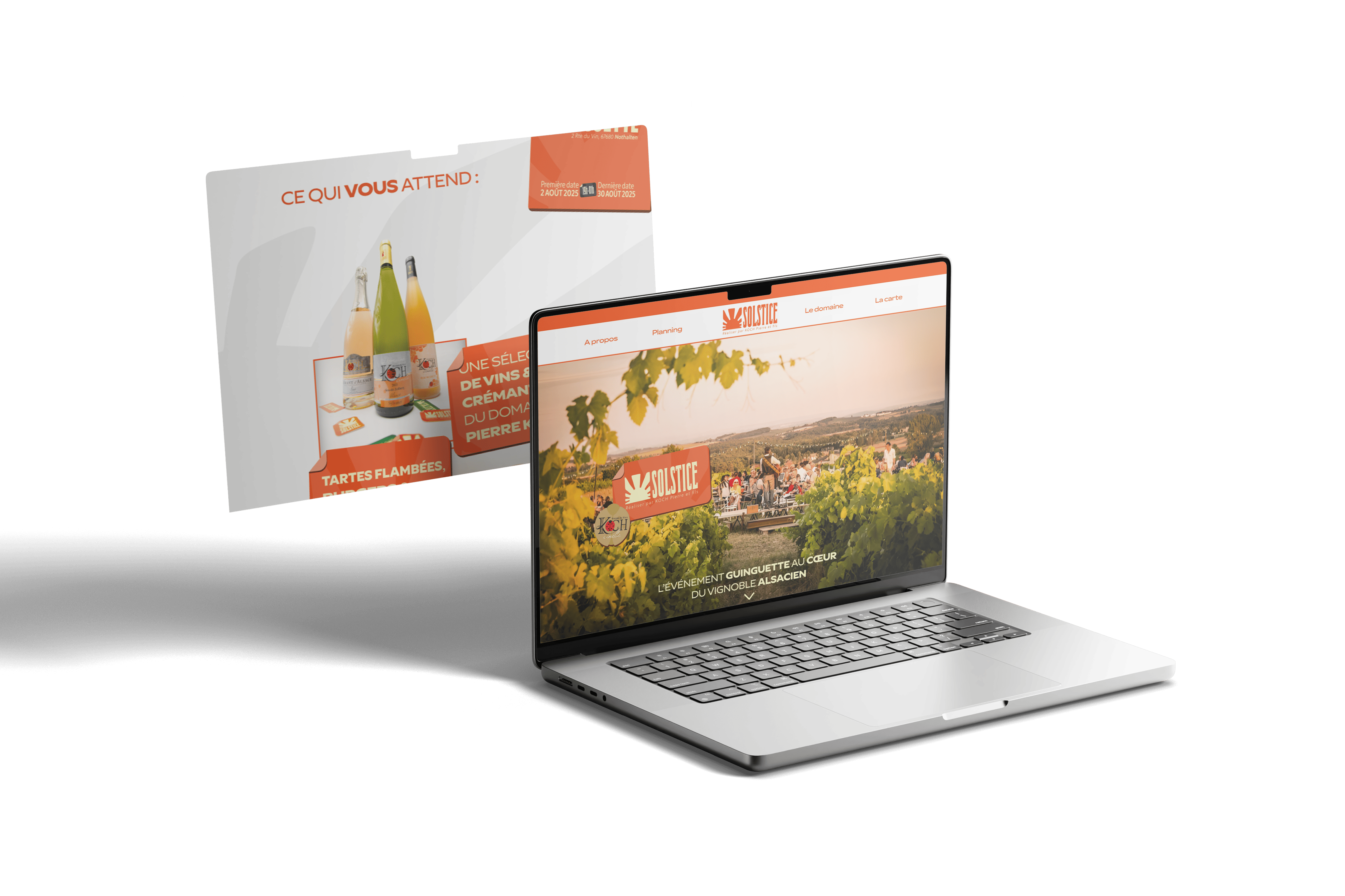 Solstice est mon projet de fin d’étude, conçu pour valoriser un événement estival imaginé par le Domaine Pierre Koch & Fils. Chaque samedi d’août, ce domaine familial transforme ses vignes en guinguette contemporaine, mêlant dégustation de vins biologiques, cuisine traditionnelle et musique live dans une ambiance chaleureuse et conviviale.